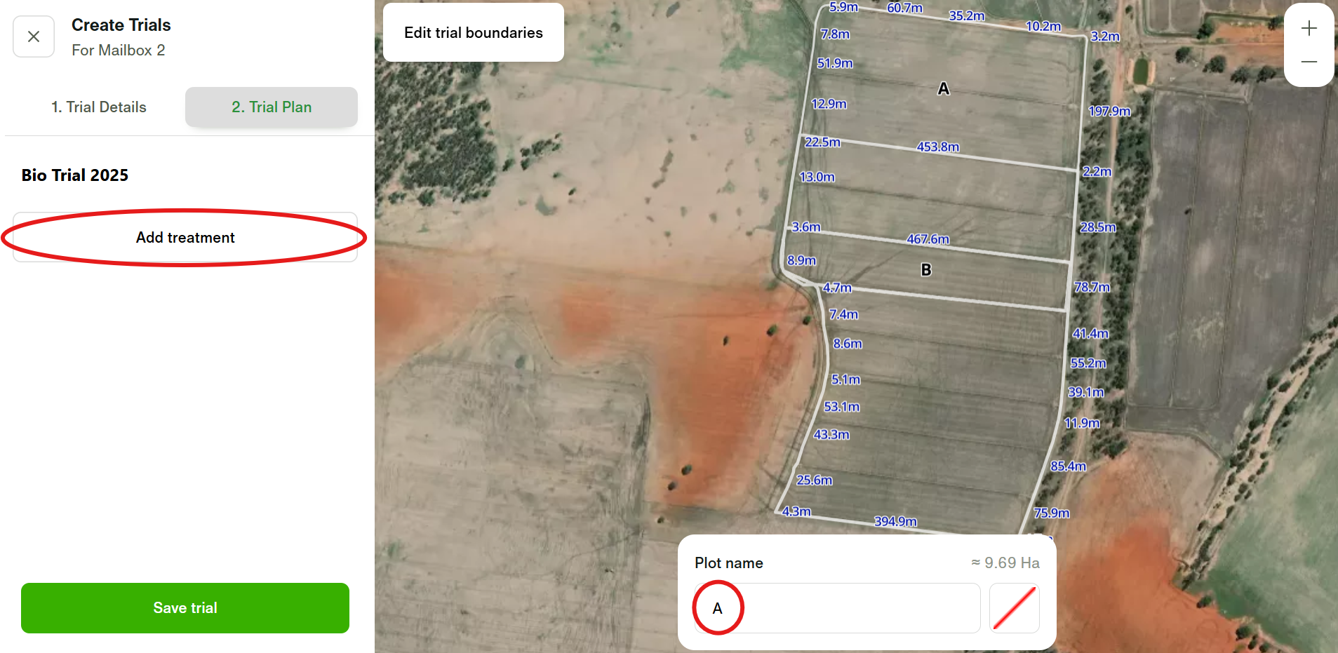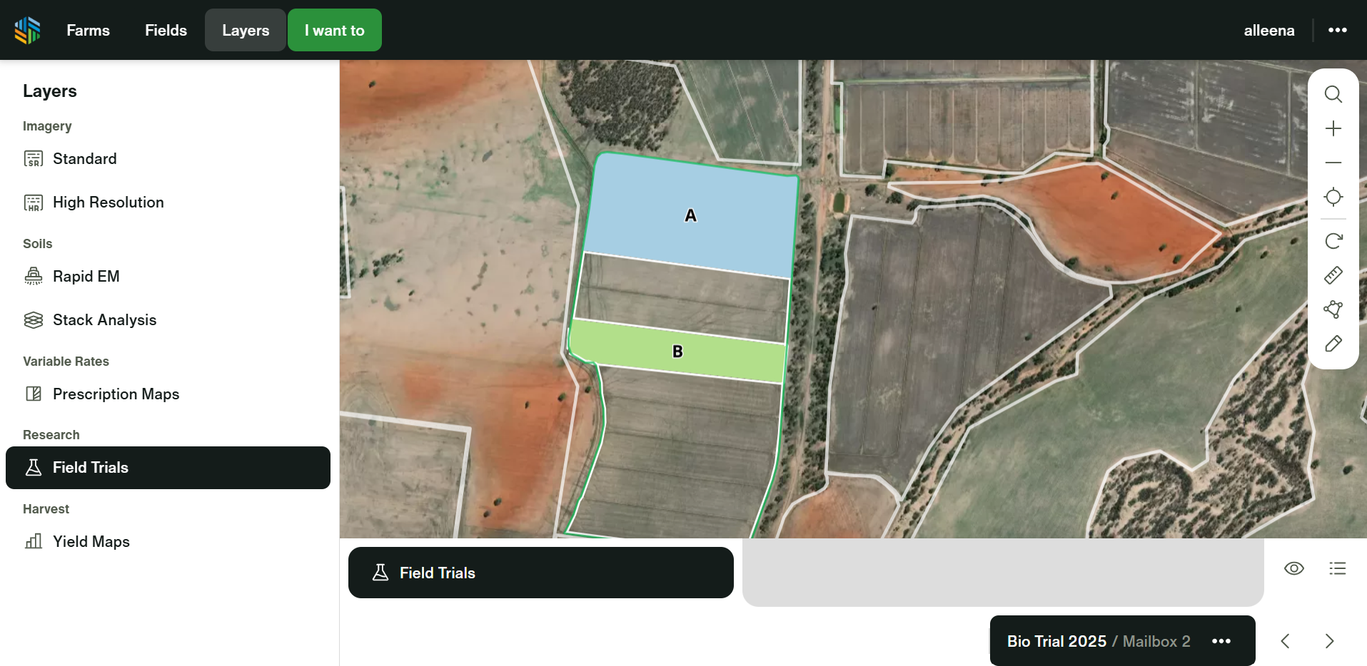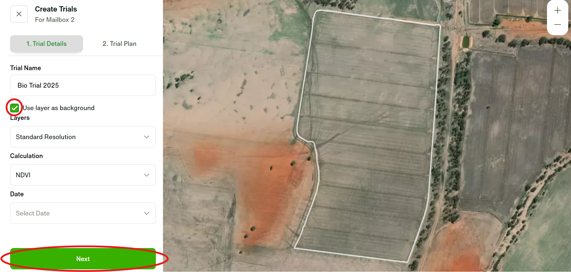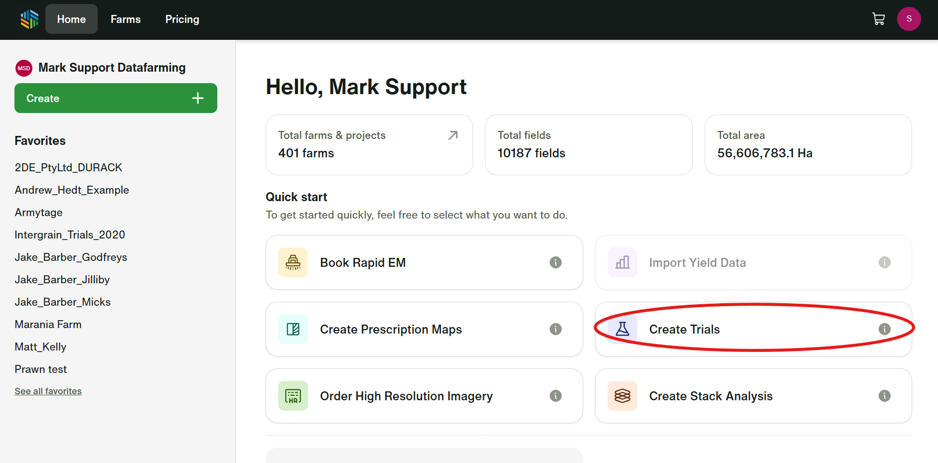 To create a trial, click on the Create Trials button on the Home screen or under the 'I want to' menu when in the Farms tab.