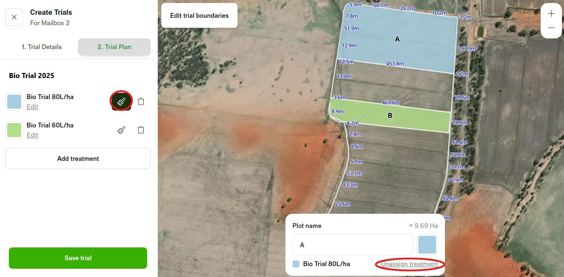 Once a treatment has been created, use the paintbrush to apply it to a plot. If needed, you can remove the treatment by clicking, Unassign treatment.
