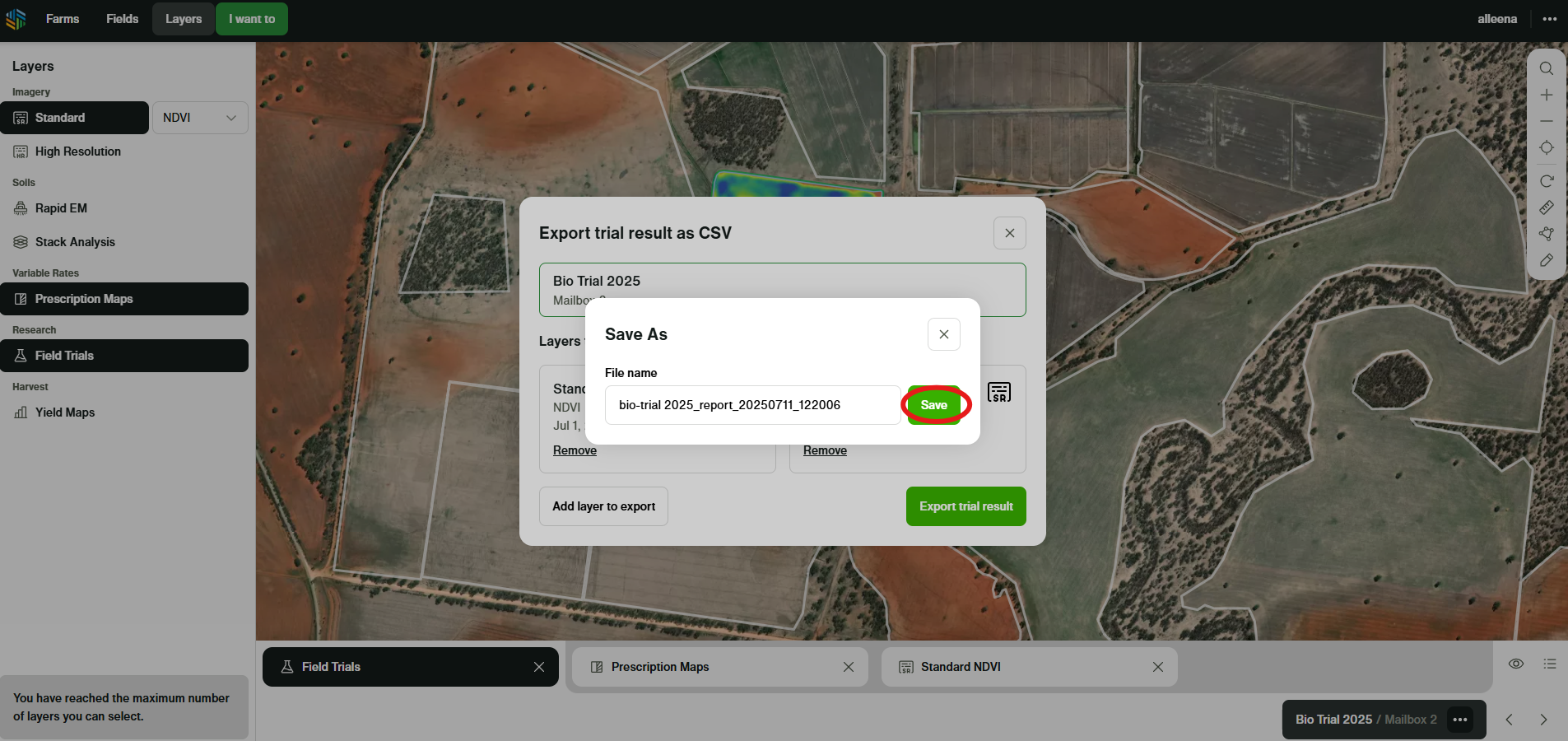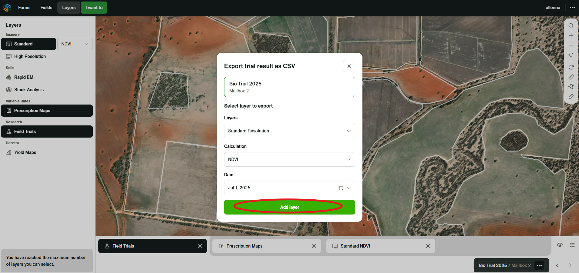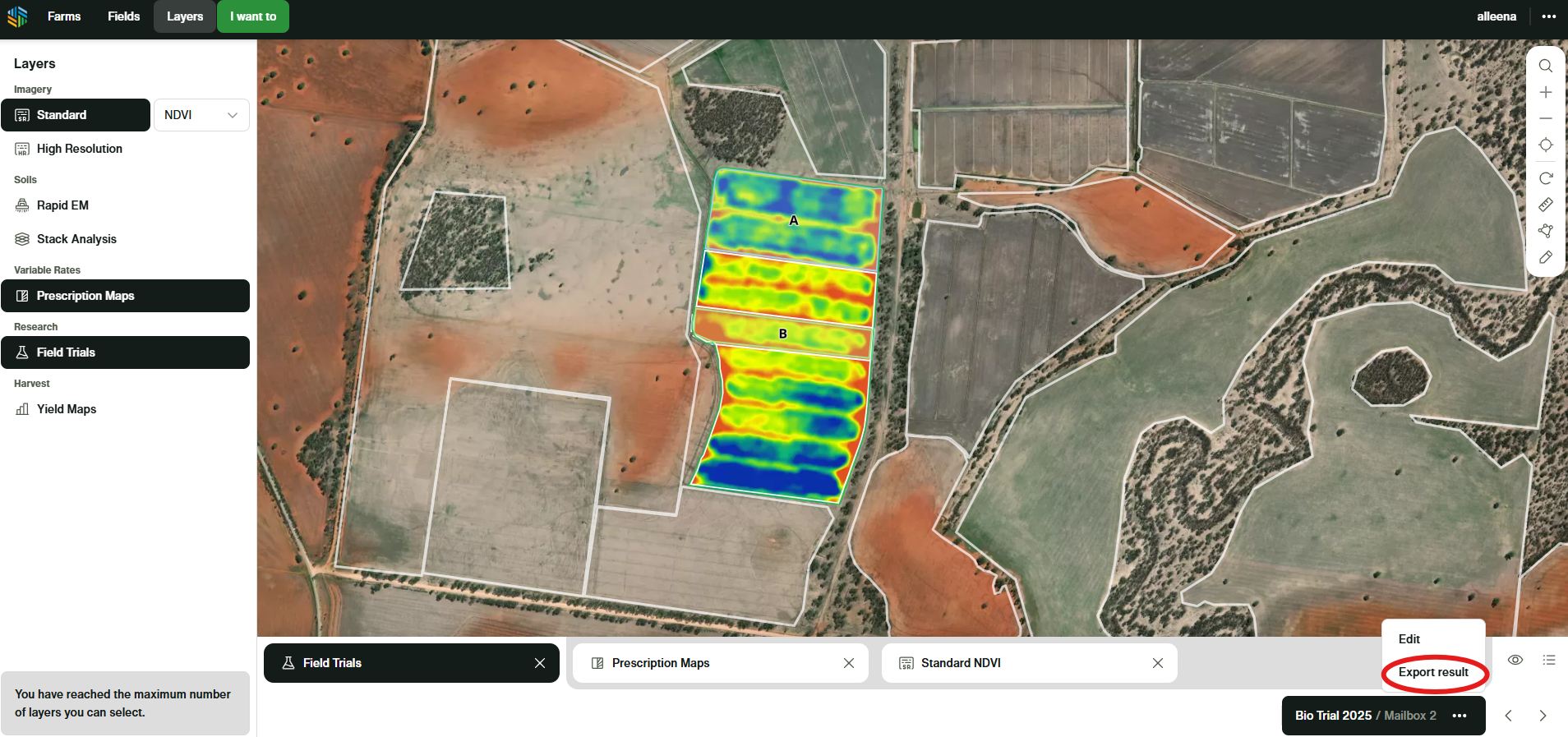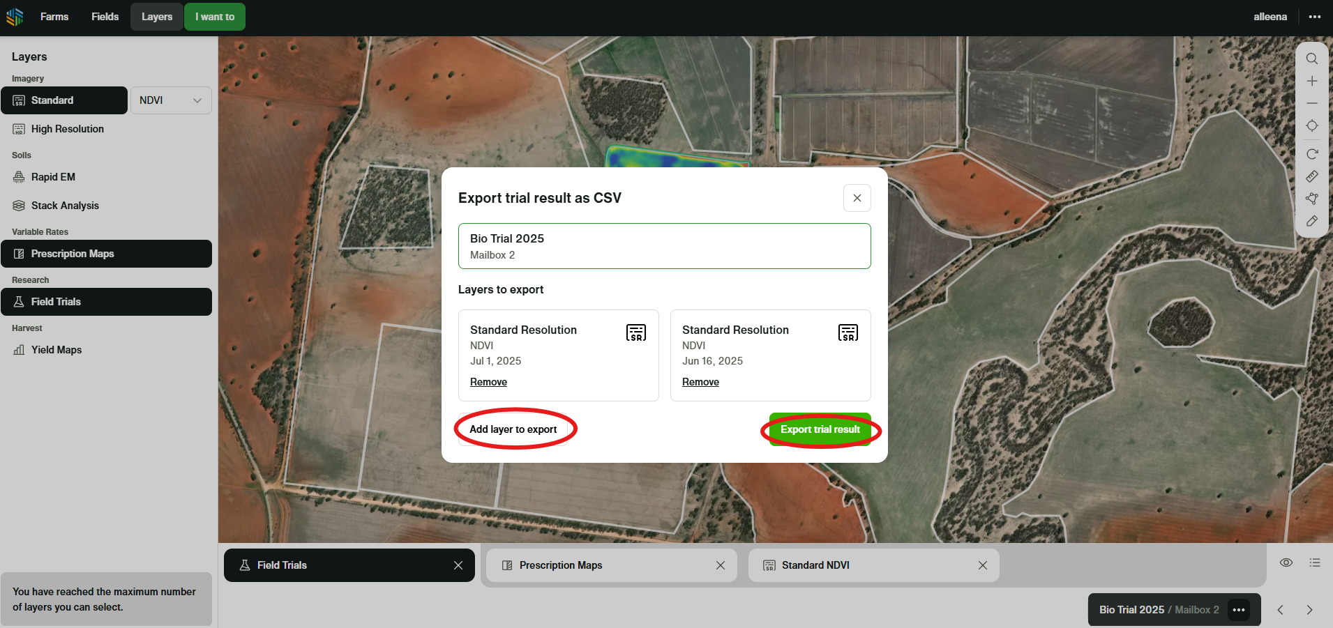 You can then add additional NDVI dates, using the 'Add layer to export' button. After you have added all the images you want to include in the analysis, select, Export trial result.
