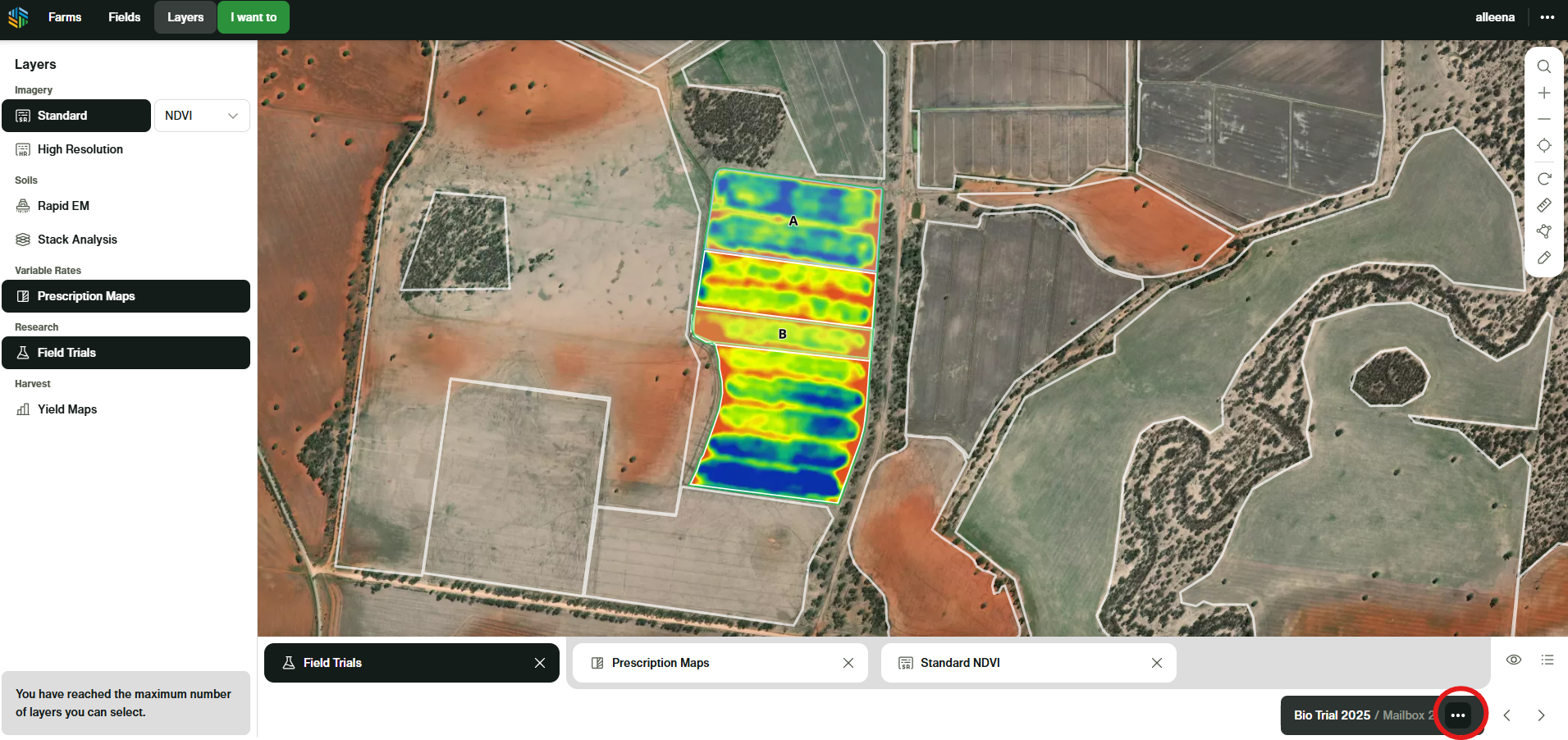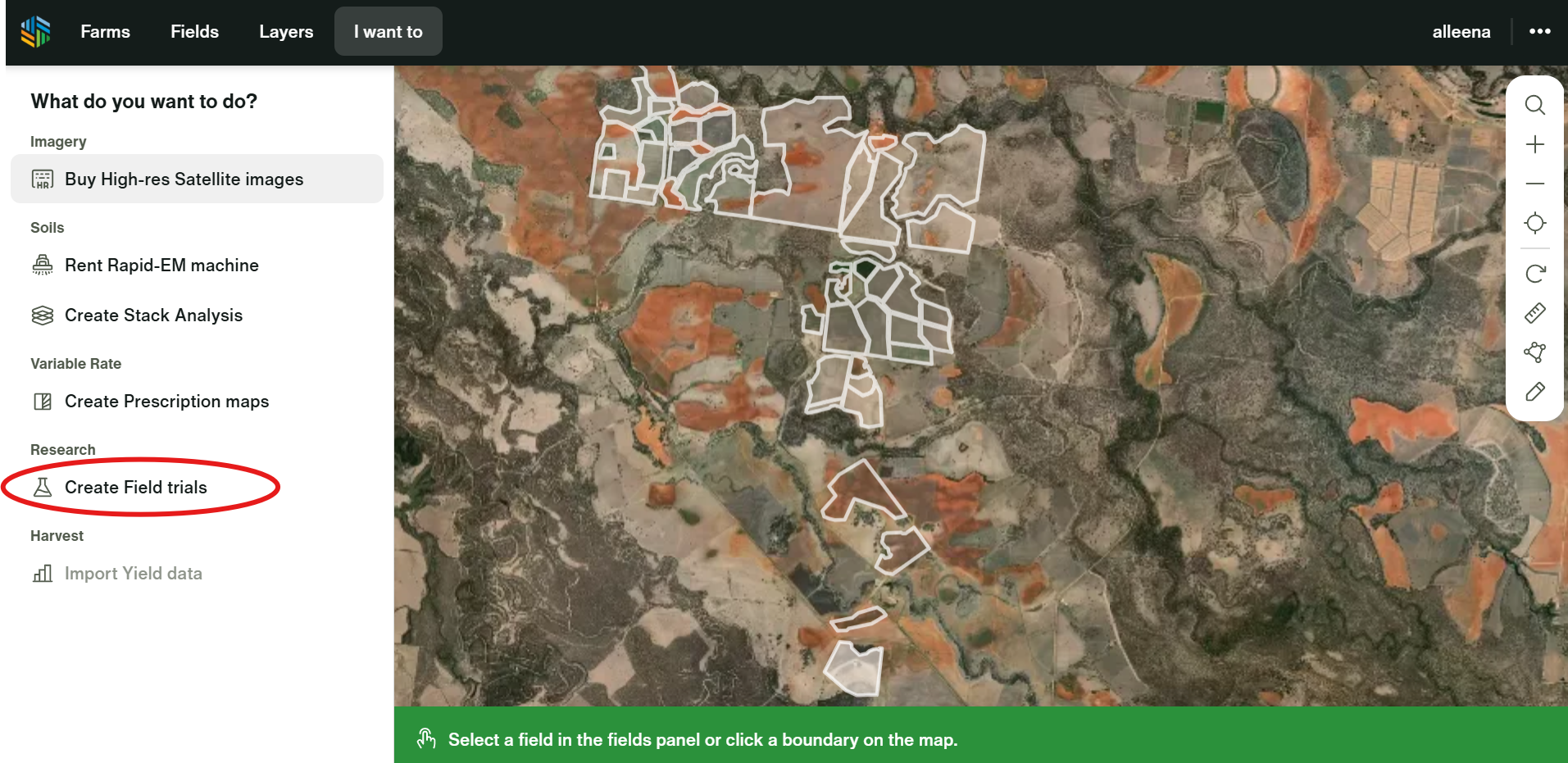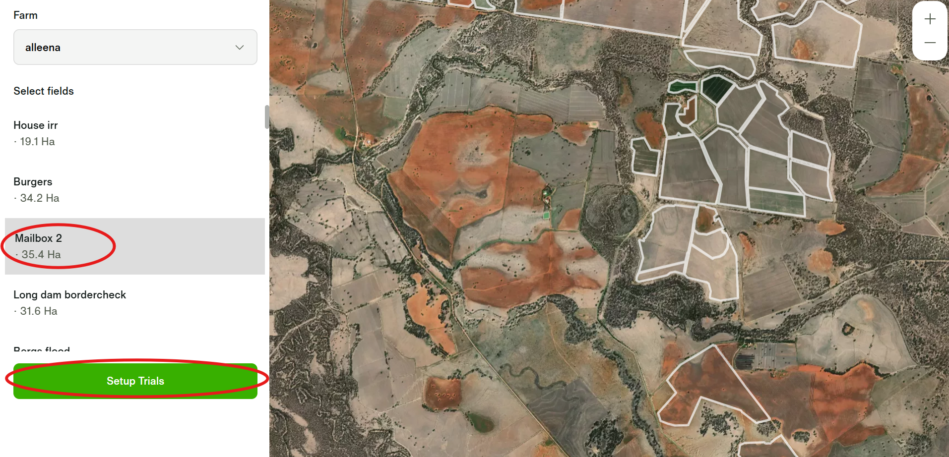 Select the field(s) you are running a trial in from the list on the left hand side (if not already selected) and then click, Setup Trials.