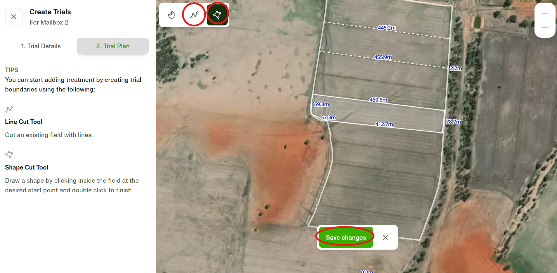 Next, use either the line Cut Tool or Shape Cut Tool to draw in your trial areas. Then select, Save changes.