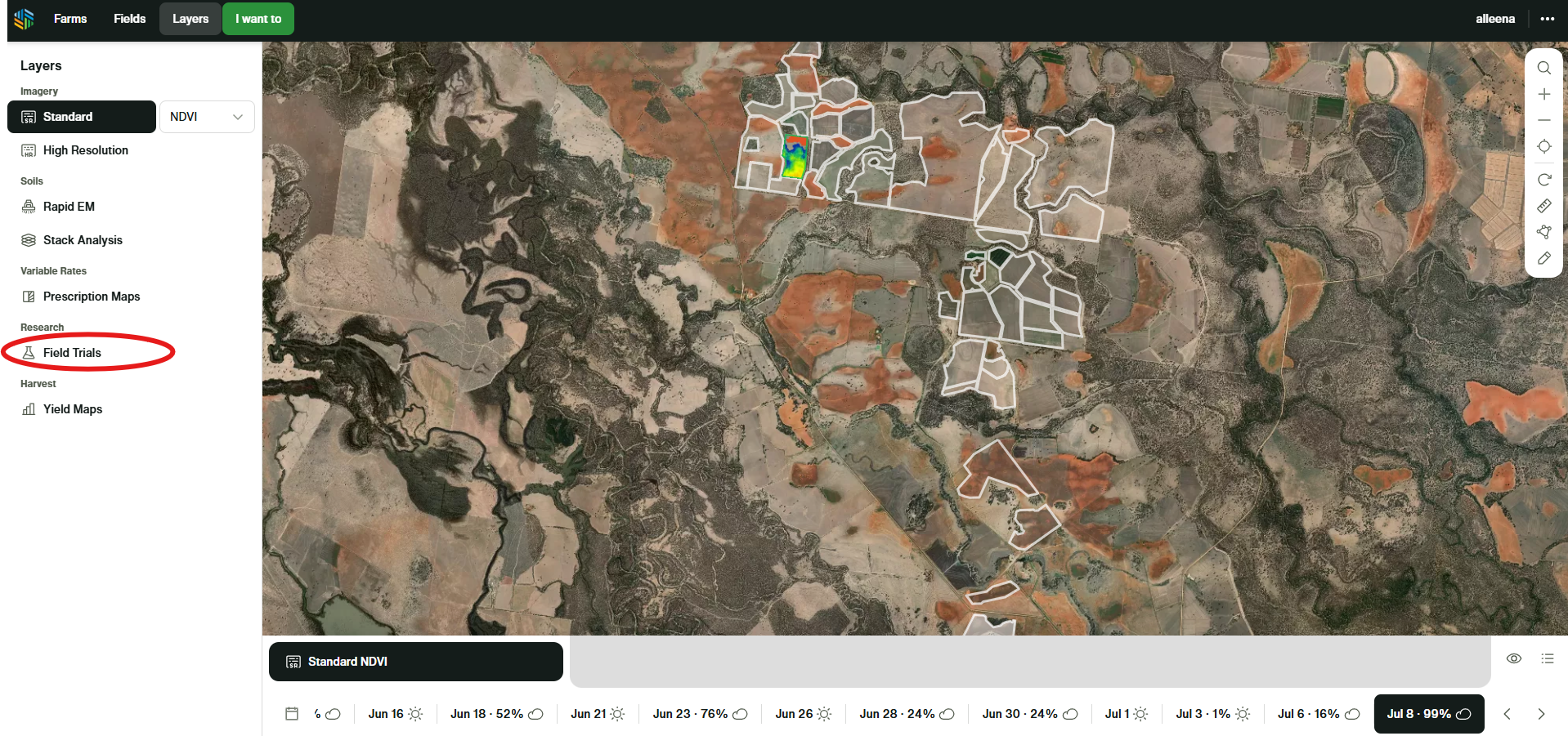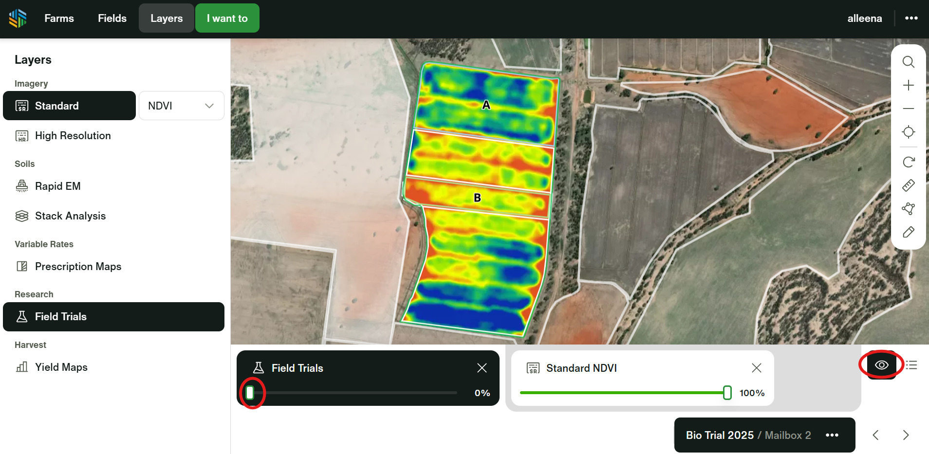 To view imagery under your trial plots, select the kind of imagery and indices you wish to view, then reduce the view trial layer transparency to 0%, by clicking the eye button and then using the slider.