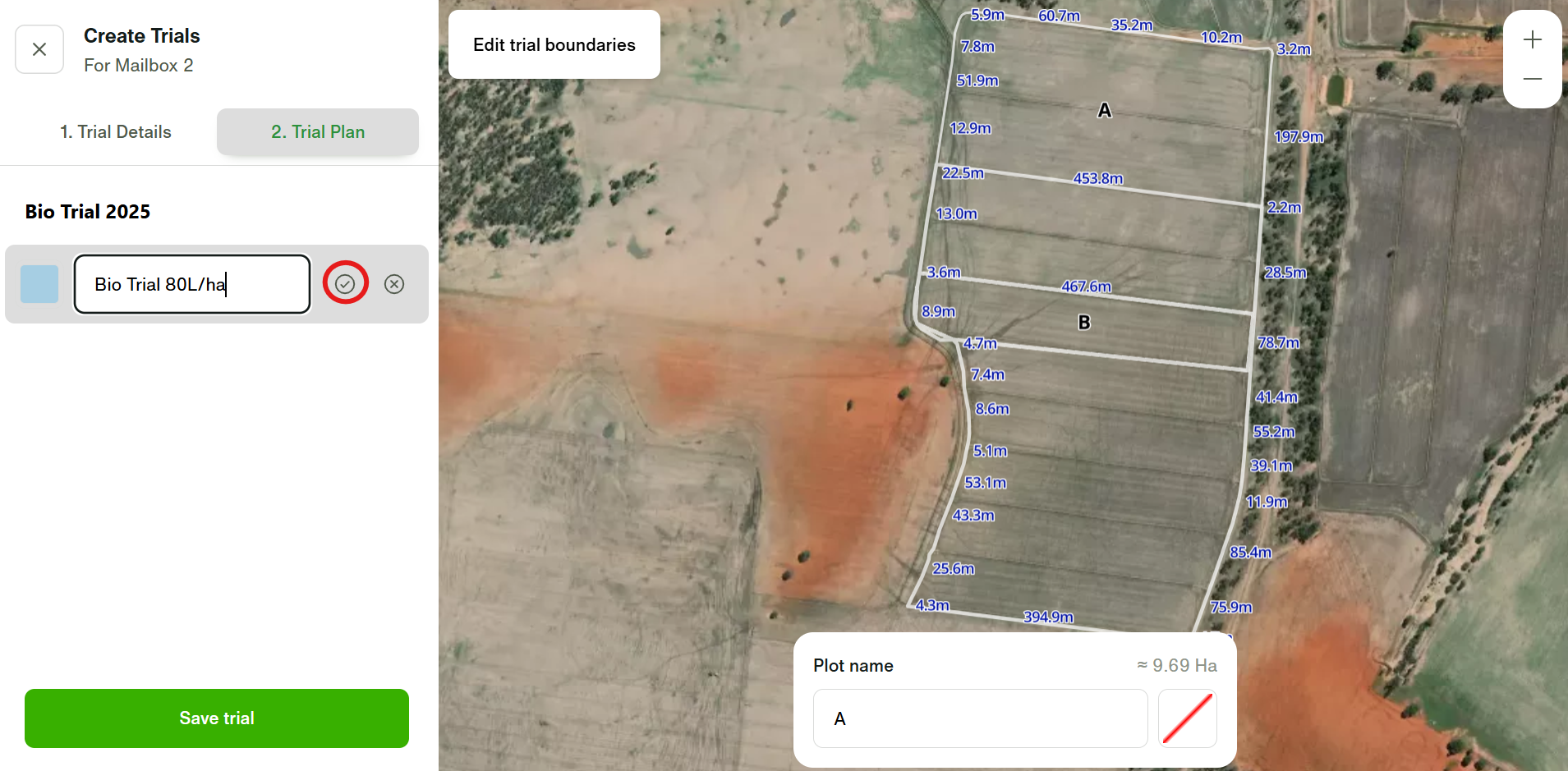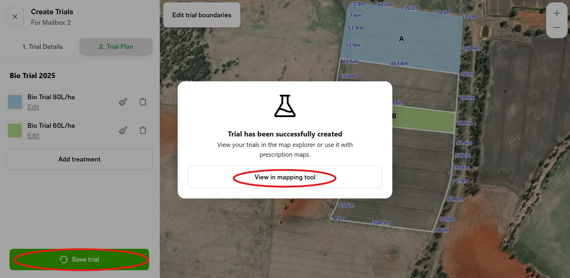 Next, select to 'Save trial' and 'View in mapping tool' to navigate to viewing the trials in your field.