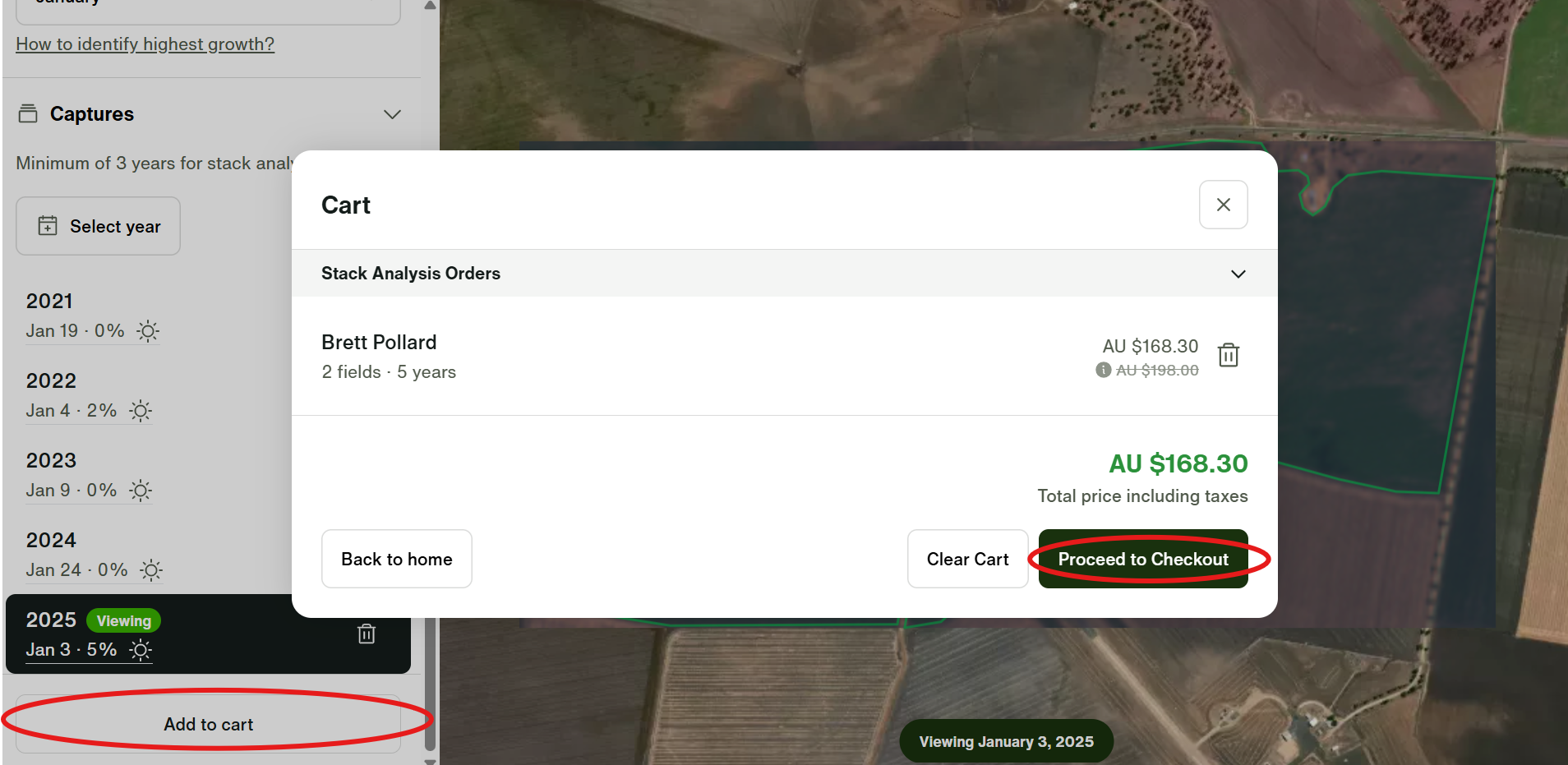 Once you have selected an image for each year, select to Add to Cart and Proceed to Checkout (Basic and Advanced Users). For Pro Users, select Create Stack Analysis - you will not be required to go through the checkout, as you have unlimited access to create STACK Analysis.