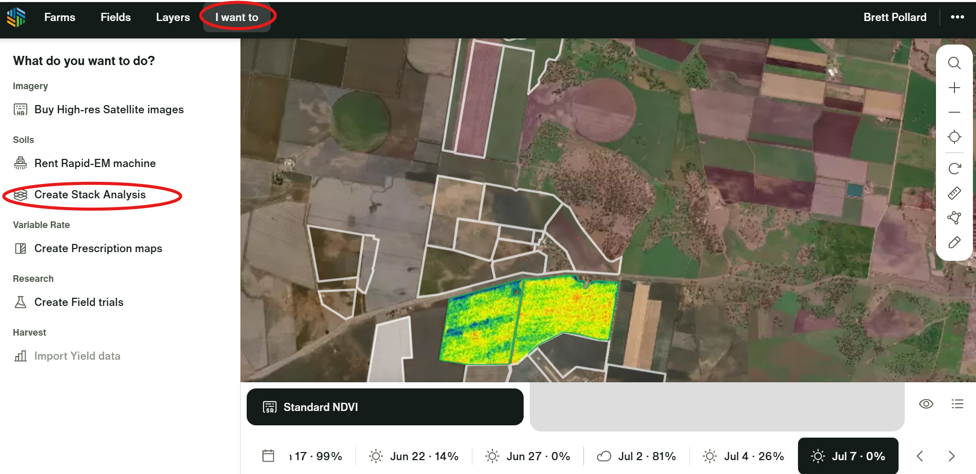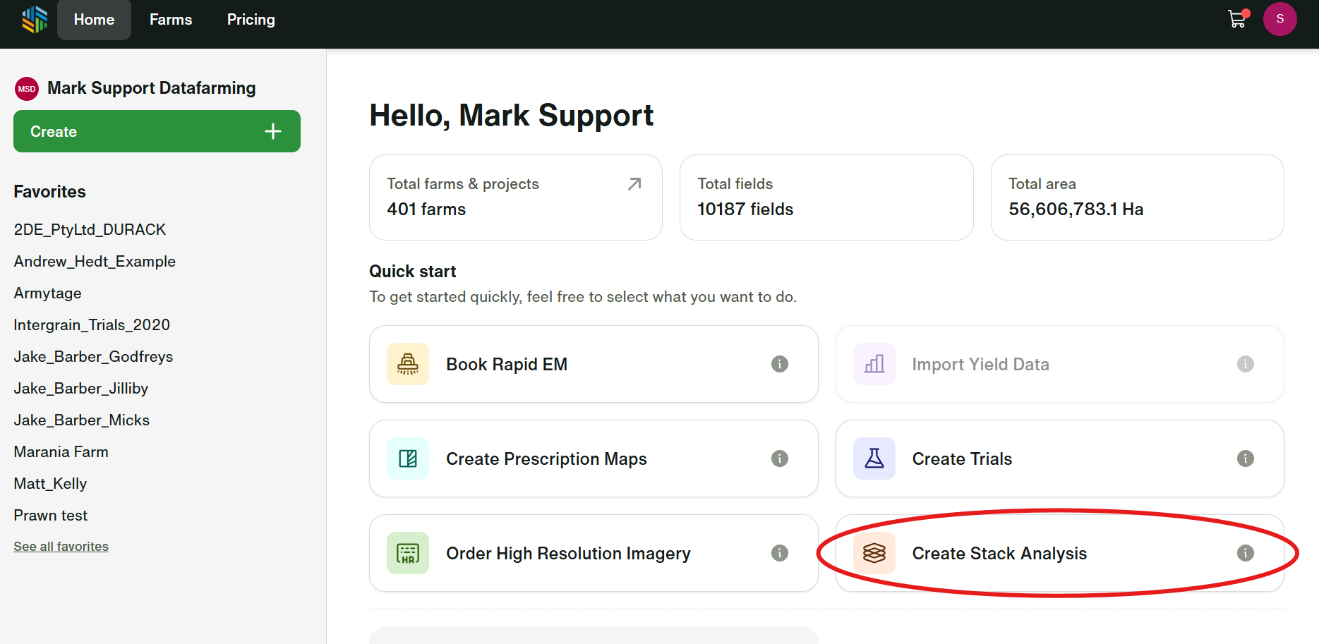 To create a STACK Analysis in DataFarming, you can click the button on the Homepage, or once you have already selected a Farm, select Stack Analysis under the 'I want to' button.