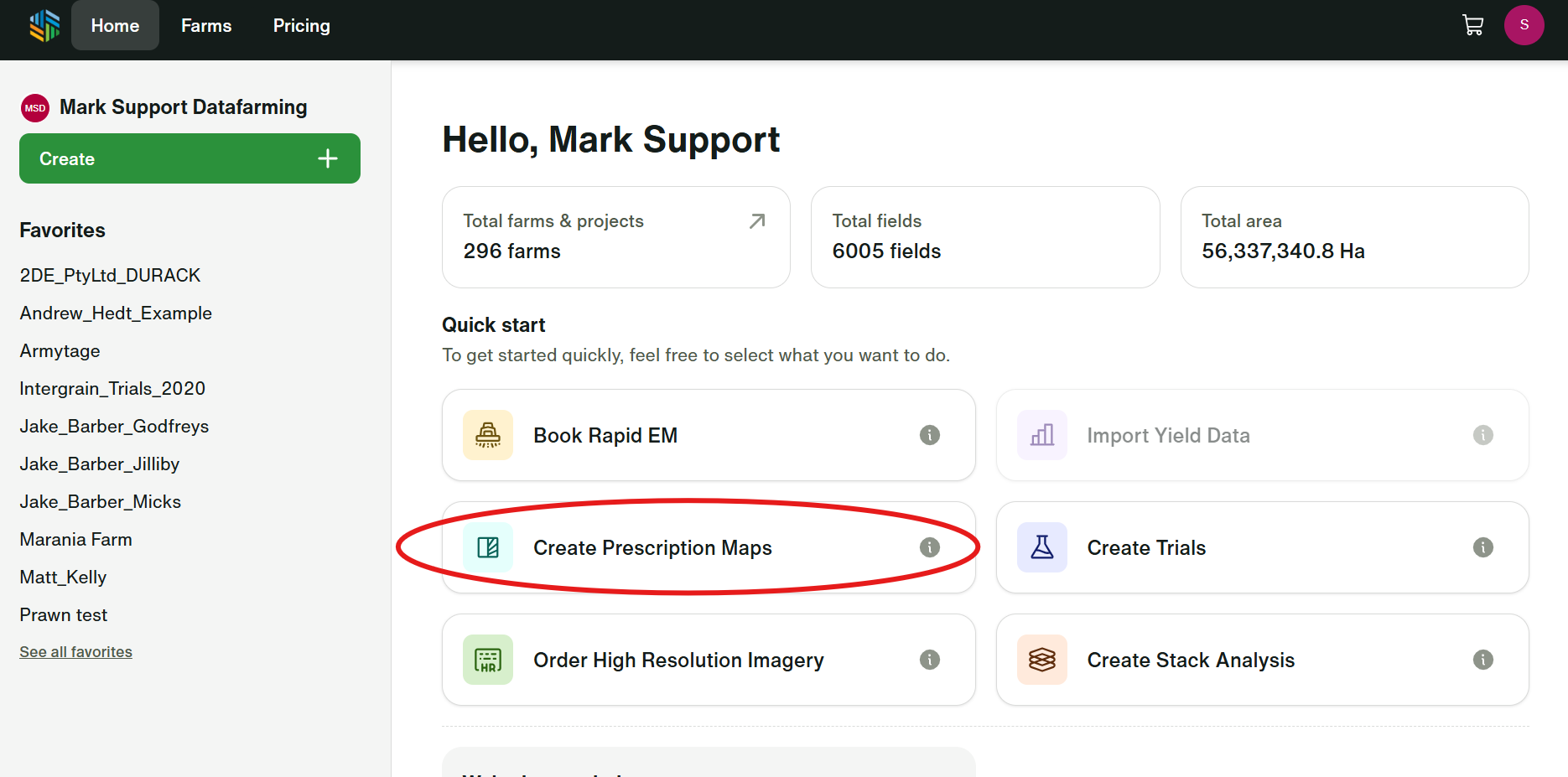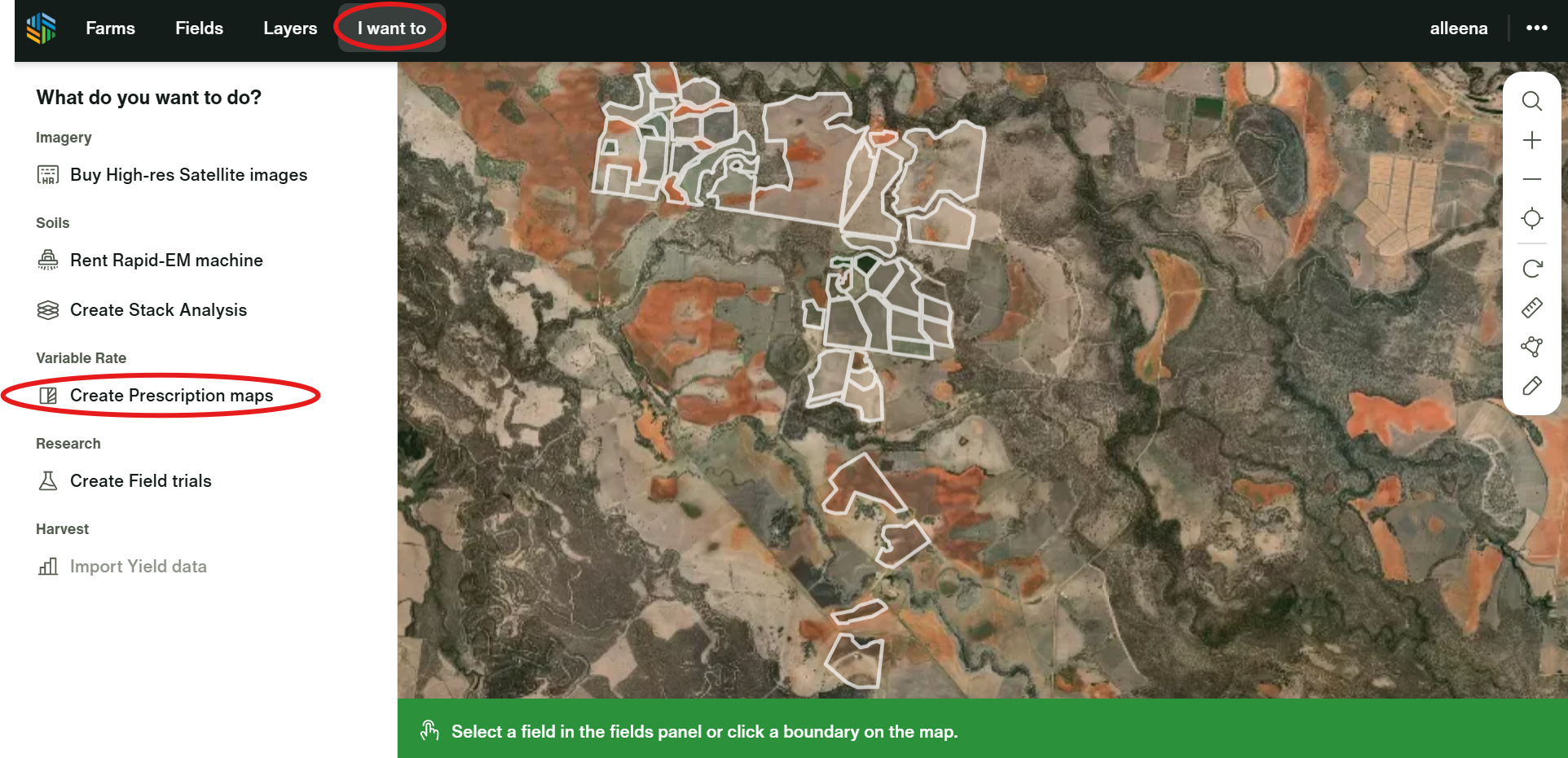 To create a Prescription Map, from a NDVI image, High-Res image, Rapid-EM™ or STACK Analysis either select the button on the Home screen or under the 'I want to' button when you are already in a Farm. Note, you will only be able to create an map from High-Res, Rapid-EM™ or STACK if you have previously used one of these tools on the field(s) you have selected.
