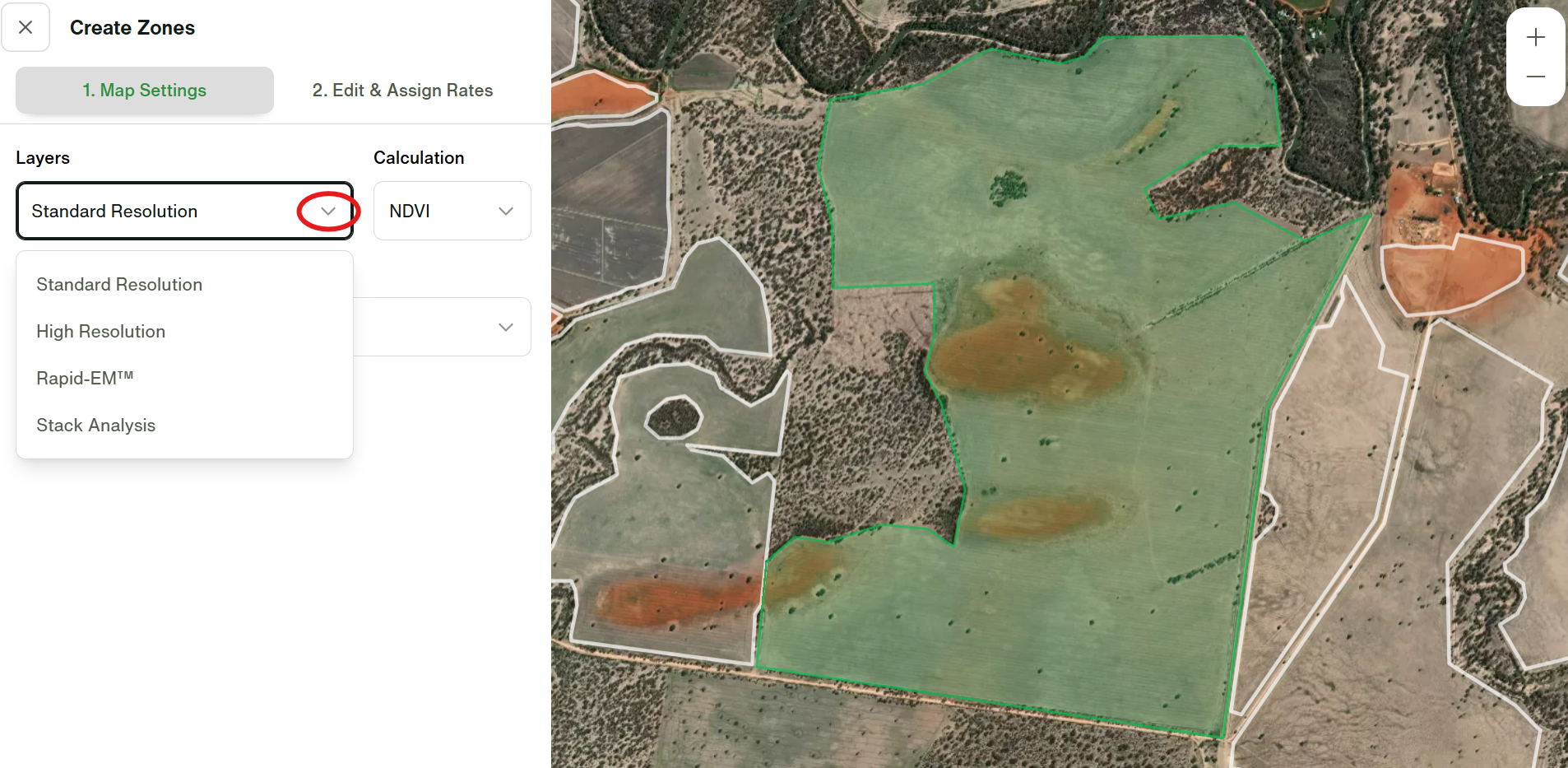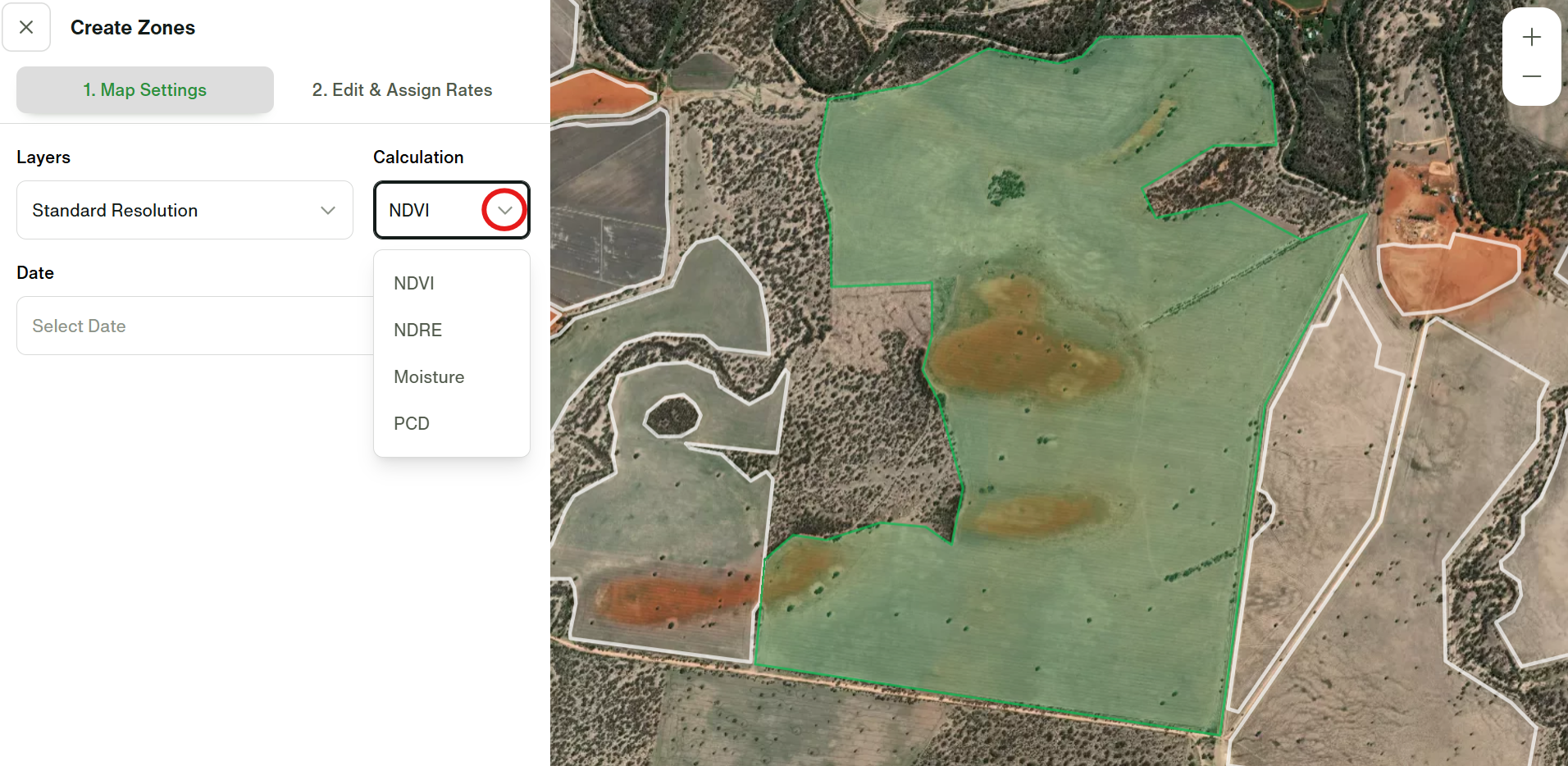 Next, select the layer you wish to use to create the map from. If you are selecting NDVI, you can also select the Calculation you'd like to use.