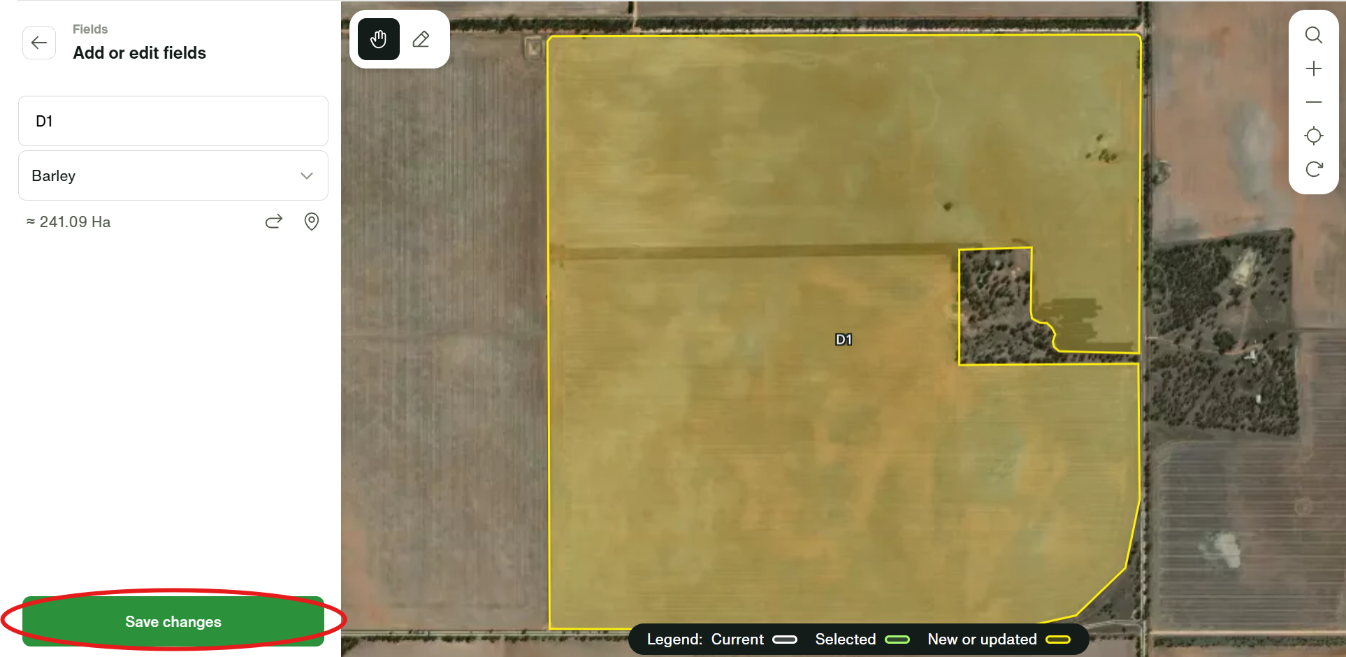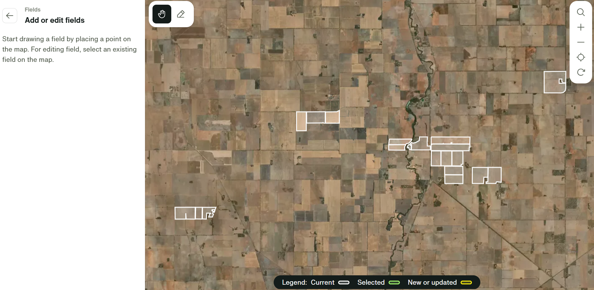 Once you have Created a Farm and opted to 'Draw fields', you'll be directed to the Add or edit field page. You can enter a location to narrow the page view or use the toolbar on the right hand side to locate your farm. Select the pencil button (✏️) ...
