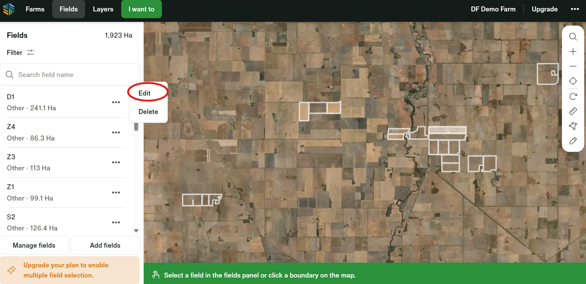 You can delete a field, by navigating to the fields tab, under a farm. Option 1: Select a field by either clicking the 3 dots next to the field name and then selecting 'Delete'. Next, you'll be prompted to make sure you want to delete the field, ...