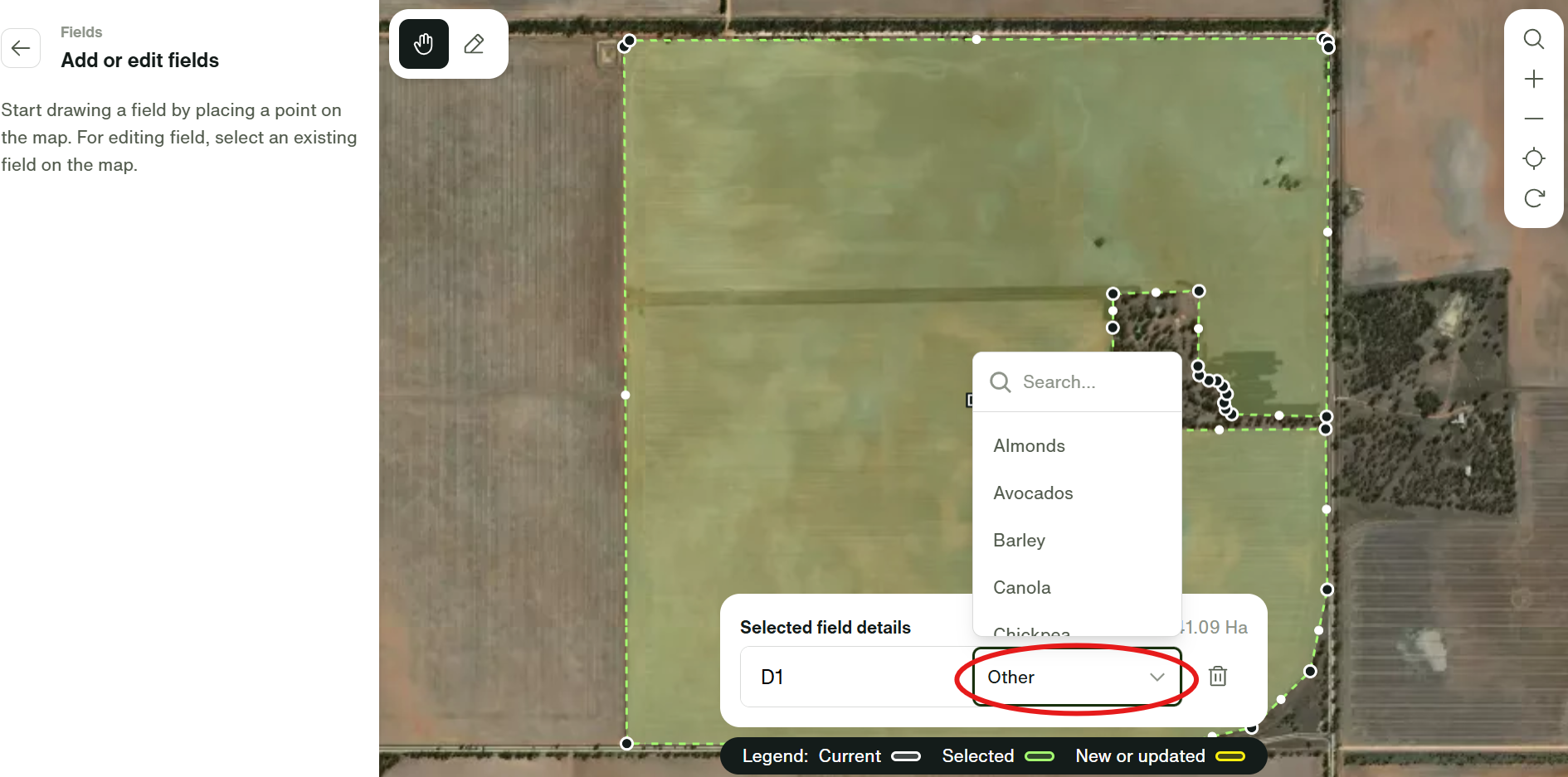 The field will become highlighted and the map will zoom to the selected field. Click on the crop type and either scroll or search to field the new crop type.