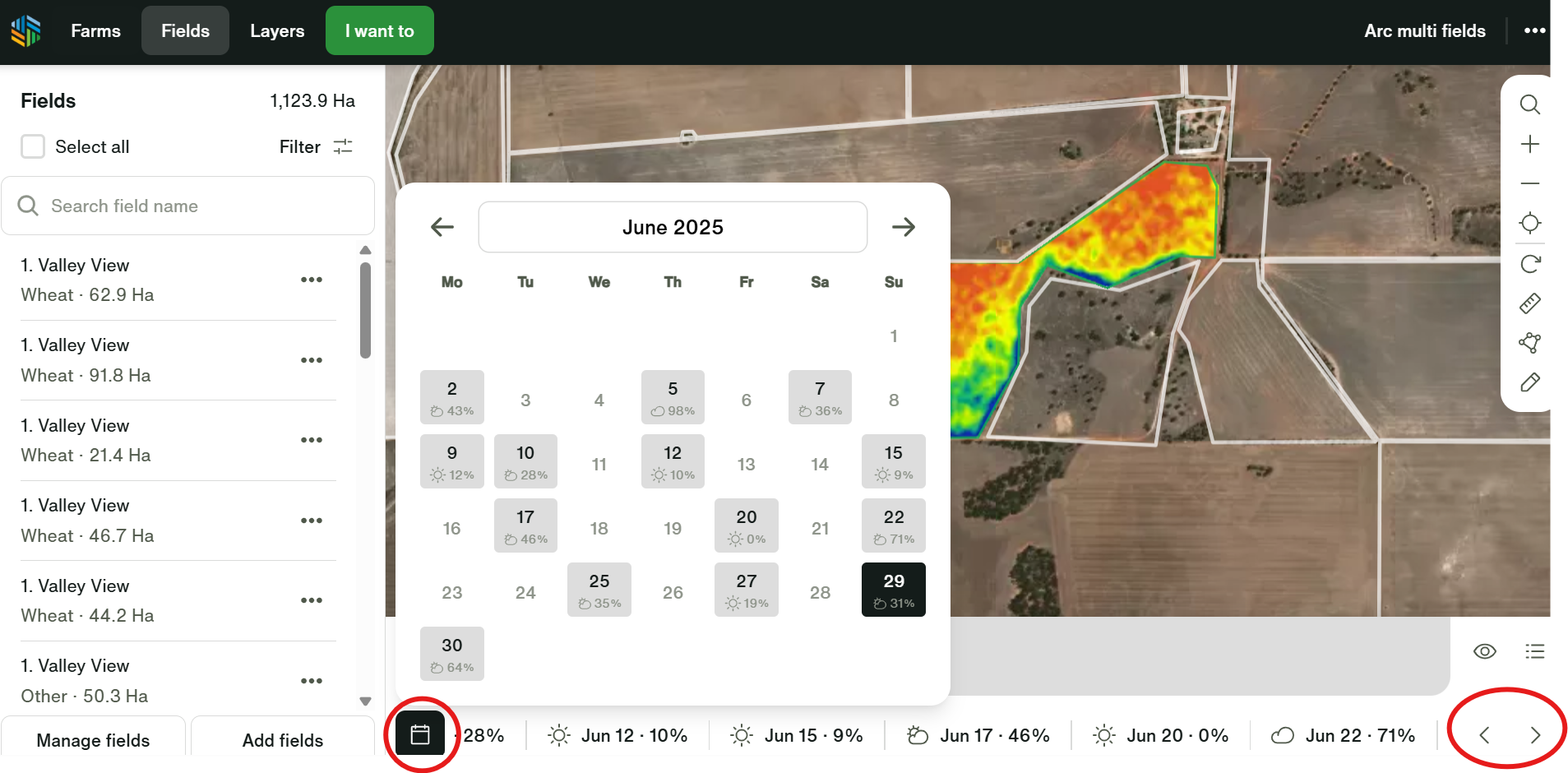 The latest NDVI image for the selected field(s) will appear, with the Date appearing as selected in the bottom right hand corner.