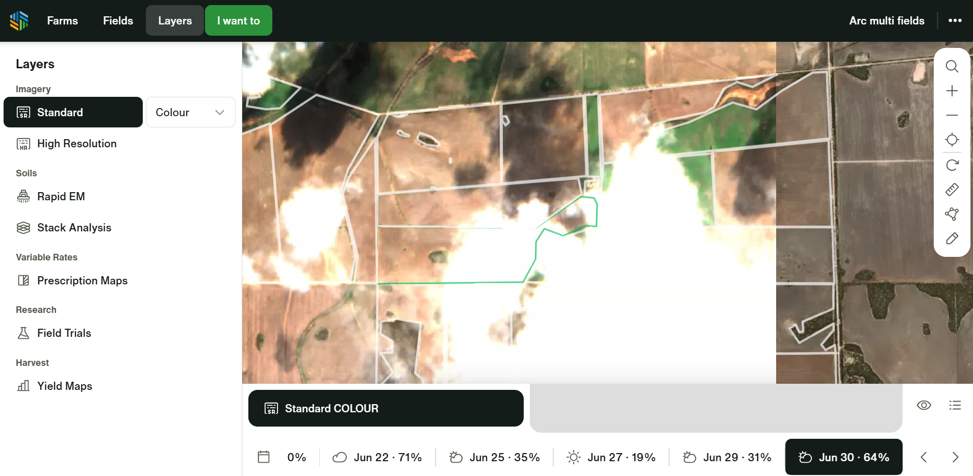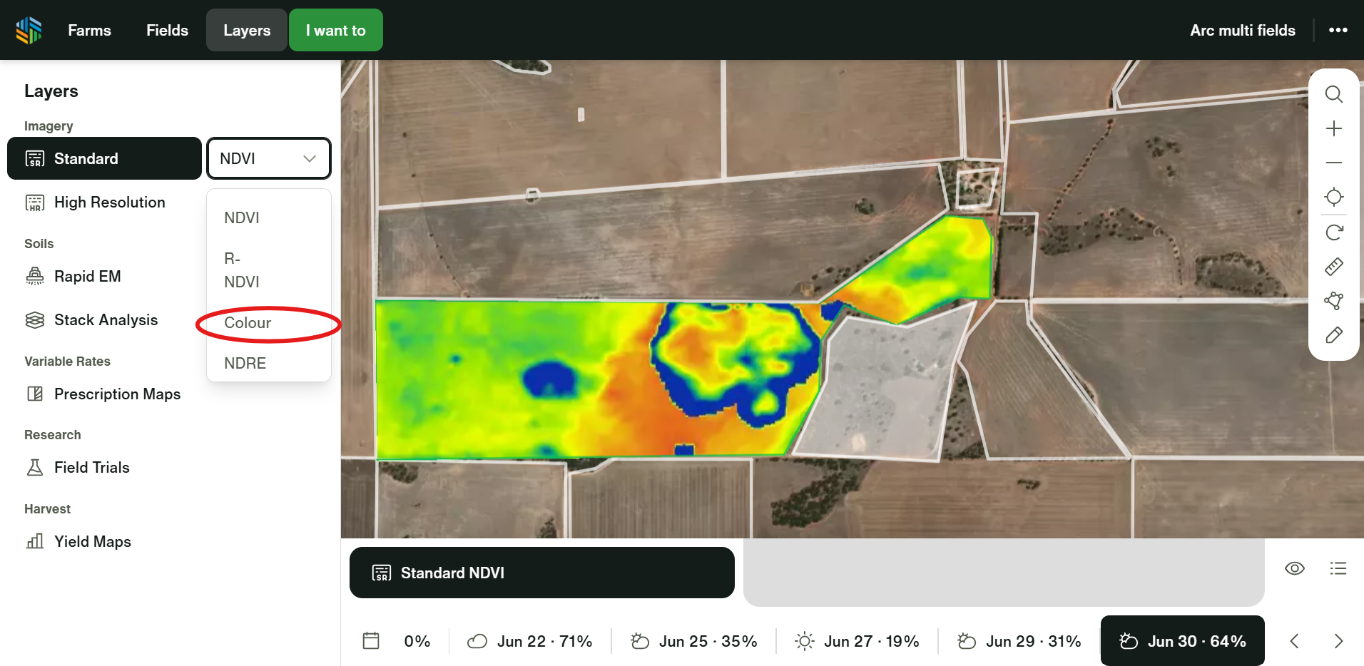 In order to determine if the cloud cover over the region is affecting the field(s) you have selected, you can use the Colour layer.