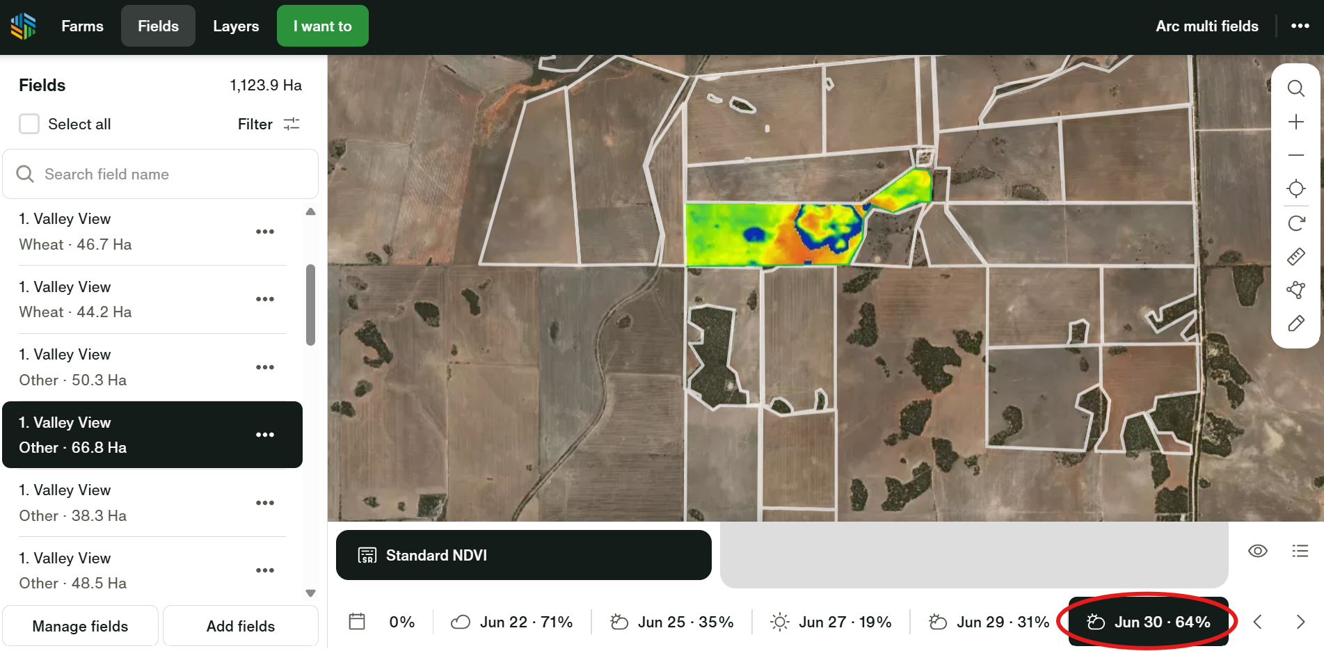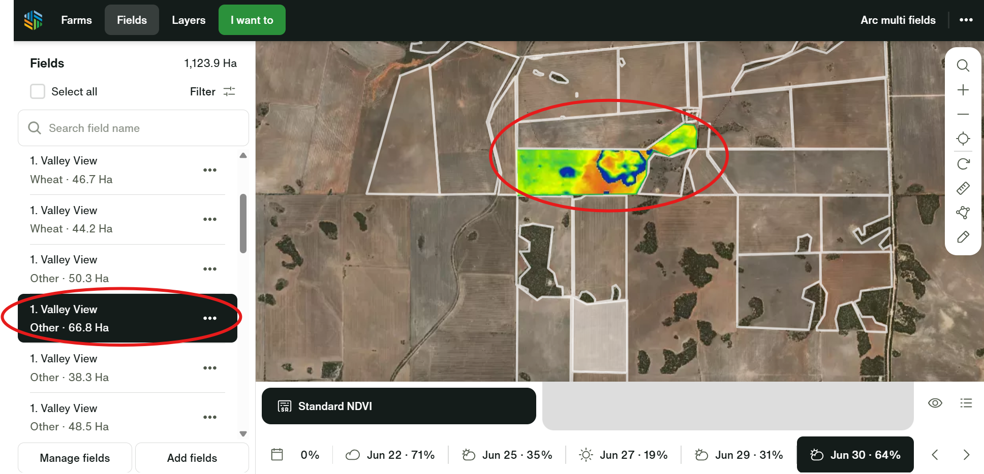 Select either a single or multiple fields (functionality, available with Advanced and Pro Subscriptions) from the list on the left hand side or on the map.